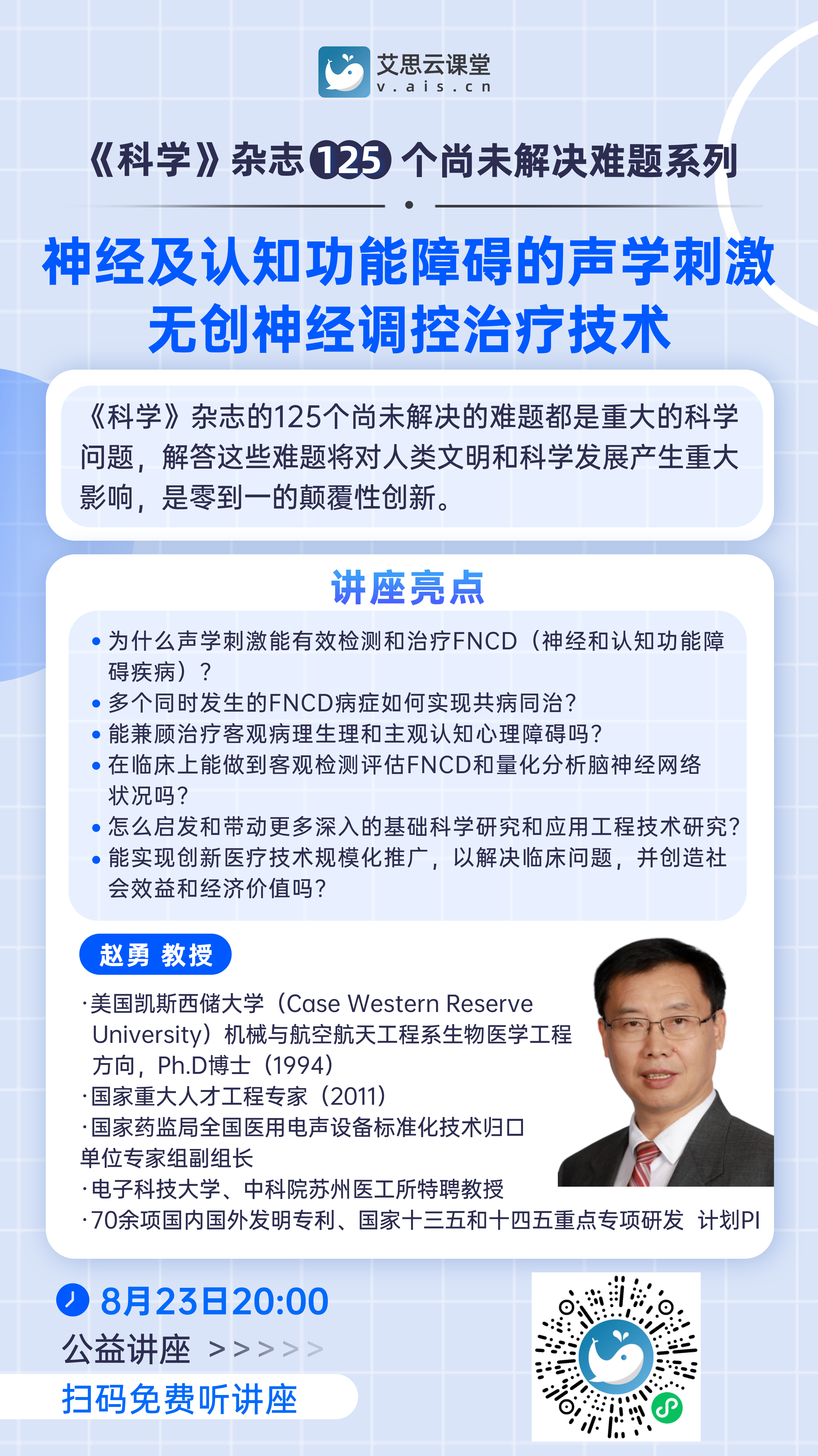 如果大家對聲學刺激無創(chuàng)神經(jīng)調(diào)控技術(shù)在神經(jīng)和認知功能障礙疾病治療中的應(yīng)用感興趣,不容錯過趙勇博士的公益講座。講座將于8月23日晚上20:00進行(掃二維碼報名參會學習)。無論是科學愛好者還是醫(yī)療領(lǐng)域從業(yè)者,這次講座都將帶給大家新的啟發(fā)和思考。